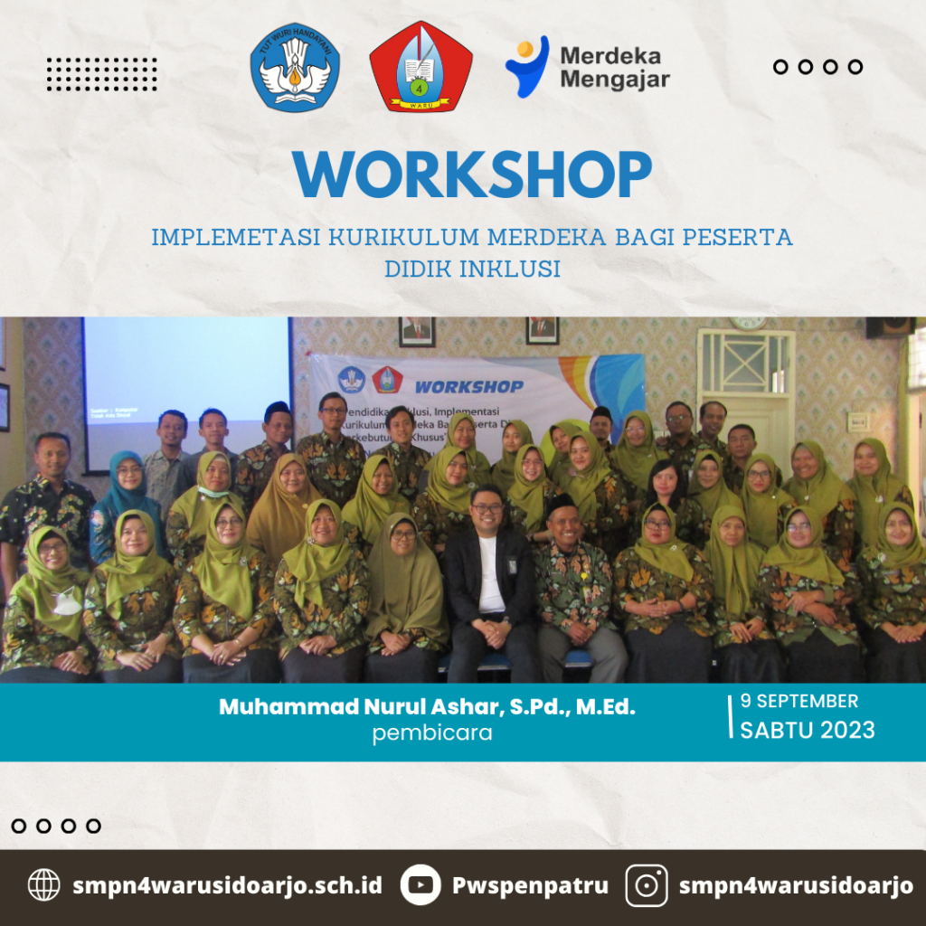 Sabtu, 9 September 2023. Seluruh guru dari SMPN 4 Waru mengikuti acara workhsop yang bertema tentang pendidikan kurikulum merdeka bagi peserta didik inklusi. Tak dapat dipungkiri, perubahan kurilum yang beralih dari K-13 ke Kumer (Kurikulum Merdeka) mengharuskan adanya adaptasi yang dilakukan di semua sektor pembelajaran. Baik SD, SMP, hingga SMA. Namun sayangnya, masih sedikit yang menerapkan pembelajaran kurikulum merdeka ini pada mereka yang berkebutuhan khusus. Kebanyakan hanya berfokus pada pendidikan ke siswa reguler, daripada inklusi.