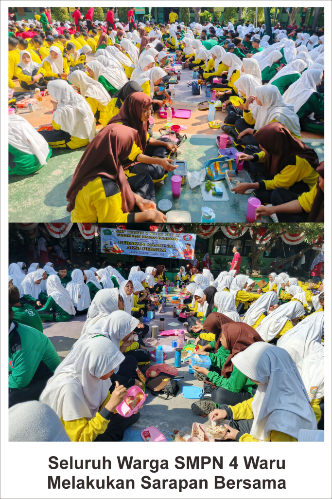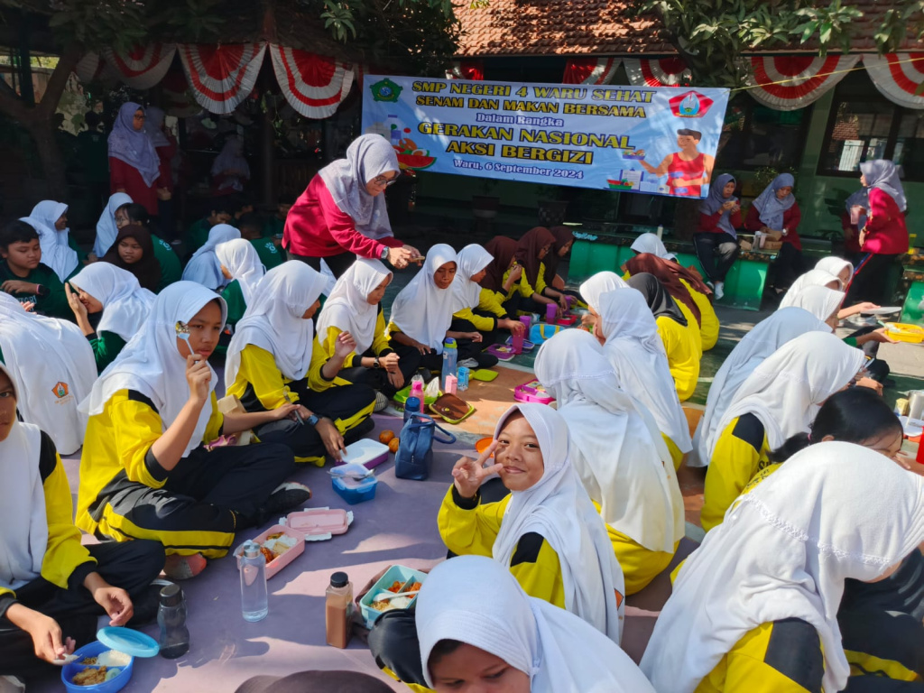 Waru, 6 September 2024 – Dalam upaya membangun kesadaran akan pentingnya pola hidup sehat di kalangan remaja, SMP Negeri 4 Waru melaksanakan kegiatan Gerakan Aksi Bergizi Serentak. Acara ini diikuti oleh seluruh guru dan siswa dari kelas 7, 8, dan 9, dengan tujuan menanamkan kebiasaan pola makan sehat dan gaya hidup aktif sejak dini.