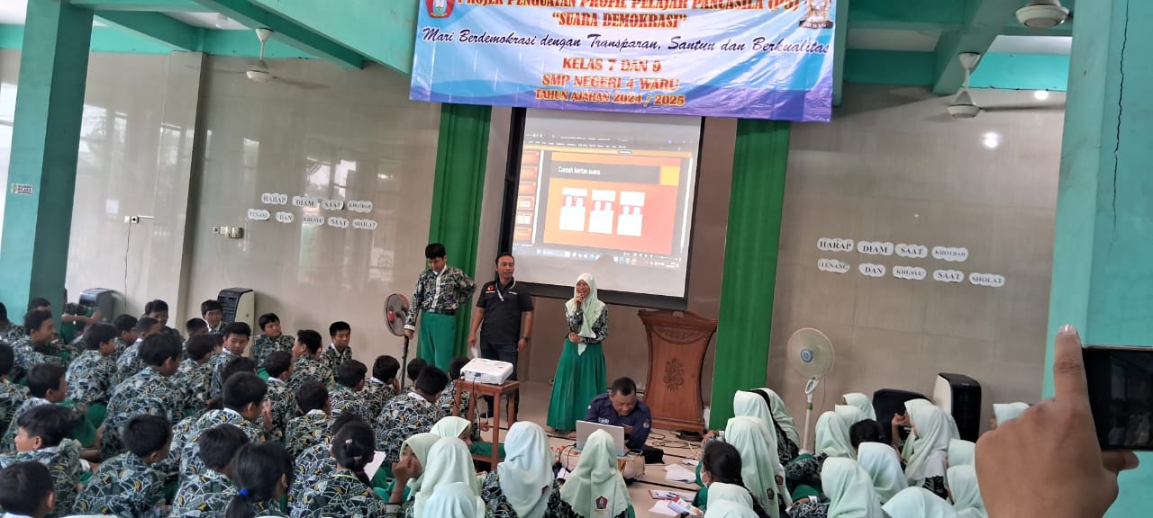 24 Oktober 2024 Dalam rangka mendukung kegiatan Profil Pelajar Pancasila SMP Negeri 4 Waru, sekolah mengundang Bapak Musa Rofi’i, S.H. (PPK Kec. Gedangan) dan Bapak Tri Lucky Susanto, S.T. (Panwaslu Kec. Gedangan) untuk melaksanakan sosialisasi pada peserta didik tentang pemilu.