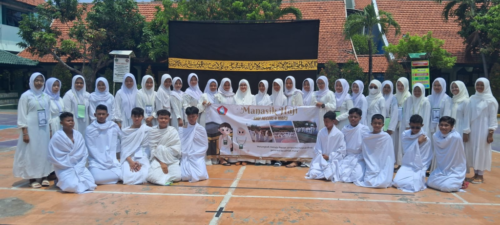 Sisa embun hujan malam menyapa dipagi yang cerah menyambut kegiatan istimewa di SMP Negeri 4 Waru. Hari itu, Sabtu, 16 November 2024, ratusan peserta didik mengenakan pakaian ihram putih berkumpul di halaman sekolah yang telah disulap menyerupai suasana Tanah Suci. Dengan penuh khidmat dan semangat antusias para peserta didik yang siap mengikuti manasik haji terpancar dari wajah mereka, setiap langkah dihari ini adalah pelajaran menuju ibadah sempurna dan pembentukan akhlak mulia. Mereka mengikuti rangkaian manasik haji, sebuah simulasi ibadah yang mengajarkan tata cara pelaksanaan rukun Islam kelima. Replika Ka’bah, Bukit Shafa dan Marwah, serta lokasi simbolik lempar jumrah, semua dihadirkan untuk menyelenggarakan kegiatan manasik haji, sebuah simulasi ibadah haji yang melibatkan seluruh peserta didik kelas 9.