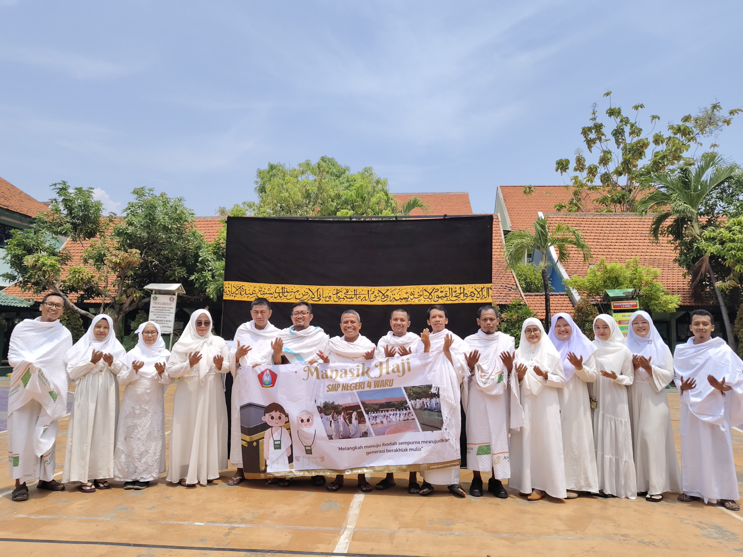 Sisa embun hujan malam menyapa dipagi yang cerah menyambut kegiatan istimewa di SMP Negeri 4 Waru. Hari itu, Sabtu, 16 November 2024, ratusan peserta didik mengenakan pakaian ihram putih berkumpul di halaman sekolah yang telah disulap menyerupai suasana Tanah Suci. Dengan penuh khidmat dan semangat antusias para peserta didik yang siap mengikuti manasik haji terpancar dari wajah mereka, setiap langkah dihari ini adalah pelajaran menuju ibadah sempurna dan pembentukan akhlak mulia. Mereka mengikuti rangkaian manasik haji, sebuah simulasi ibadah yang mengajarkan tata cara pelaksanaan rukun Islam kelima. Replika Ka’bah, Bukit Shafa dan Marwah, serta lokasi simbolik lempar jumrah, semua dihadirkan untuk menyelenggarakan kegiatan manasik haji, sebuah simulasi ibadah haji yang melibatkan seluruh peserta didik kelas 9.