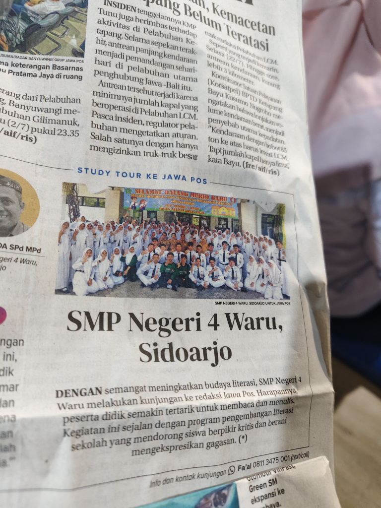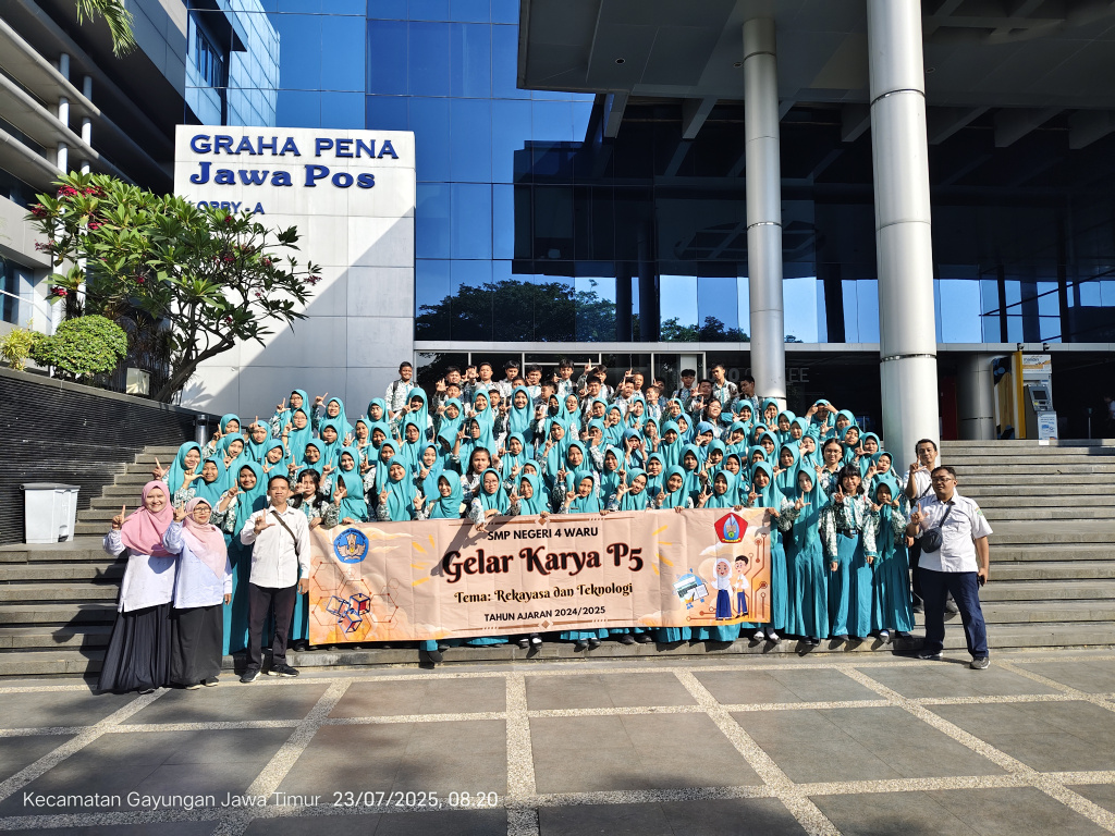 Sebagai bagian dari implementasi Projek Penguatan Profil Pelajar Pancasila (P5), SMP Negeri 4 Waru terus mendorong peserta didik untuk belajar secara kontekstual dan bermakna. Pada Rabu, 23 Juli 2025, sekolah mengadakan kunjungan edukatif ke Kantor Graha Pena Jawa Pos, Surabaya. Kegiatan ini diikuti oleh seluruh perwakilan OSIS-MPK, Tim Jurnalis Sekolah, dan Duta Literasi SMP Negeri 4 Waru.