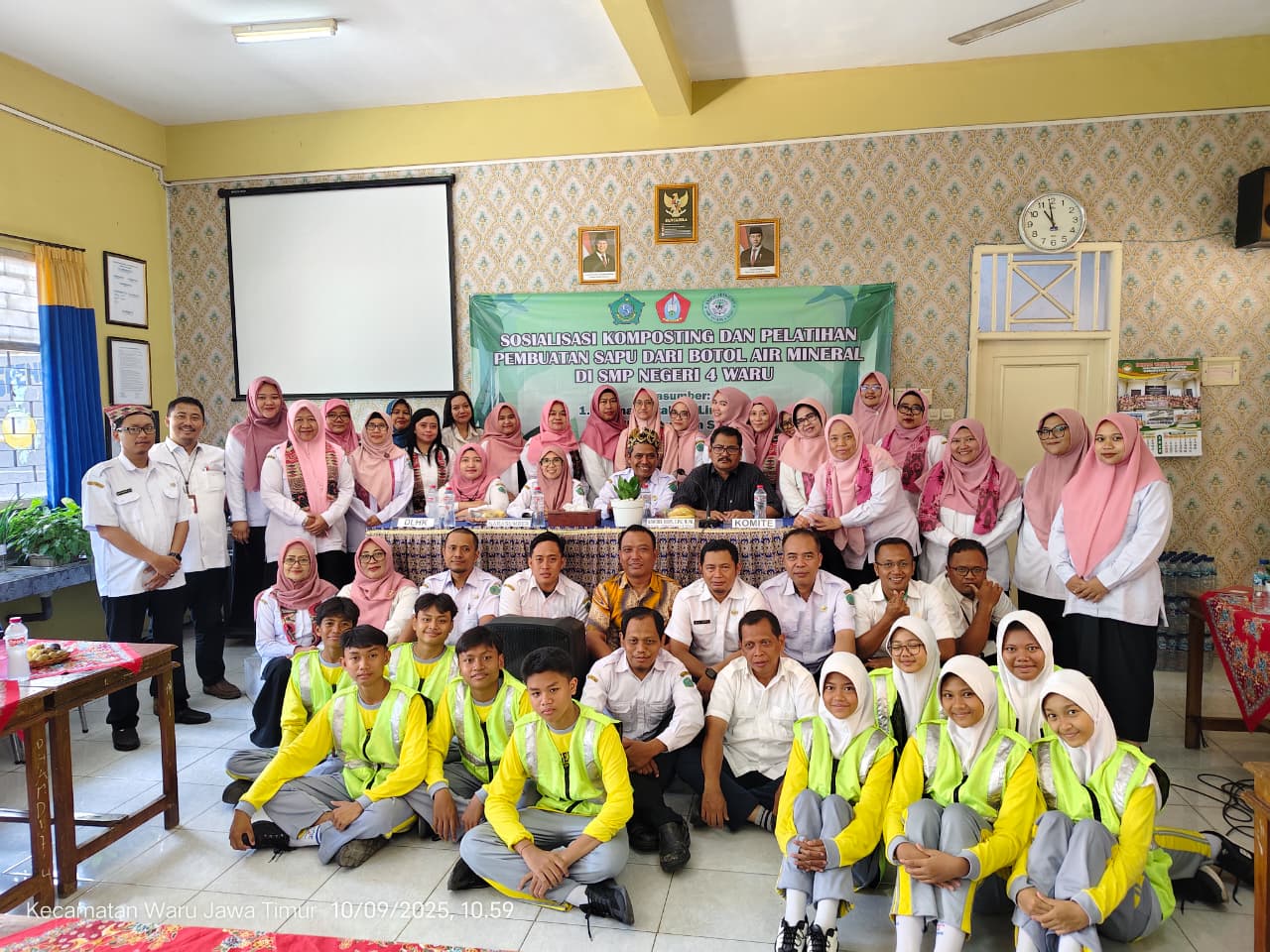 Acara diawali dengan sambutan dari Kepala Sekolah SMP Negeri 4 Waru–Bapak Khoirul Huda, S.Pd., M.Pd. kemudian dilanjutkan pemarapan langsung oleh bapak Sujiman–seorang praktisi lingkungan yang datang dari Kediri. Hasil pertemuan tersebut berupa pemberian tong Komposter dan beberapa sapu dari botol dari air mineral bekas.